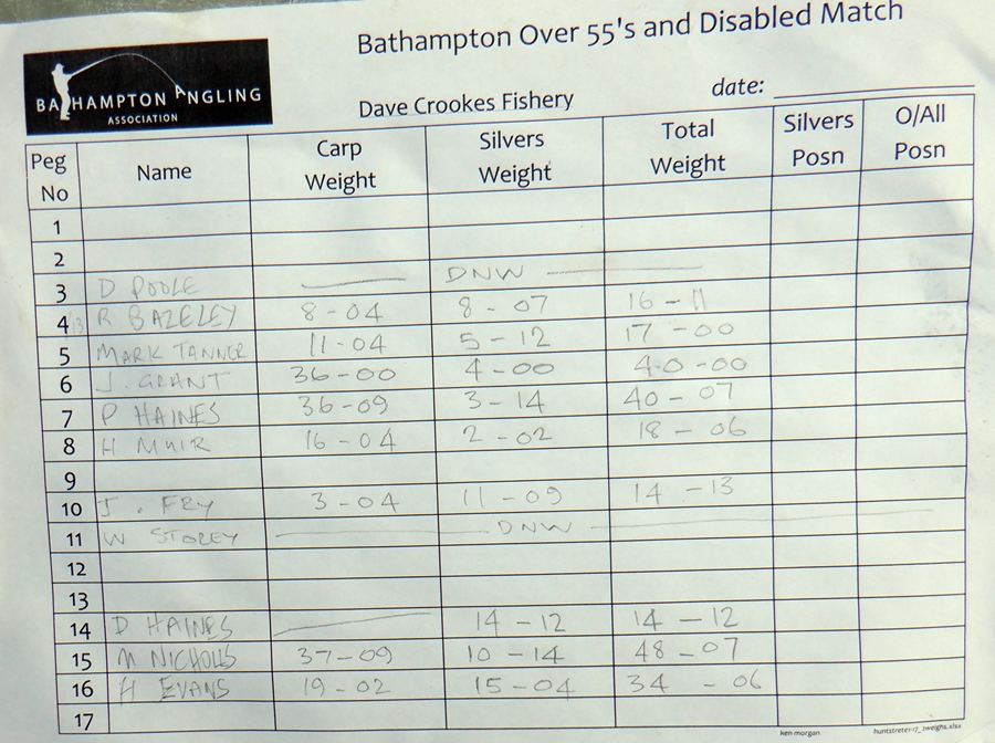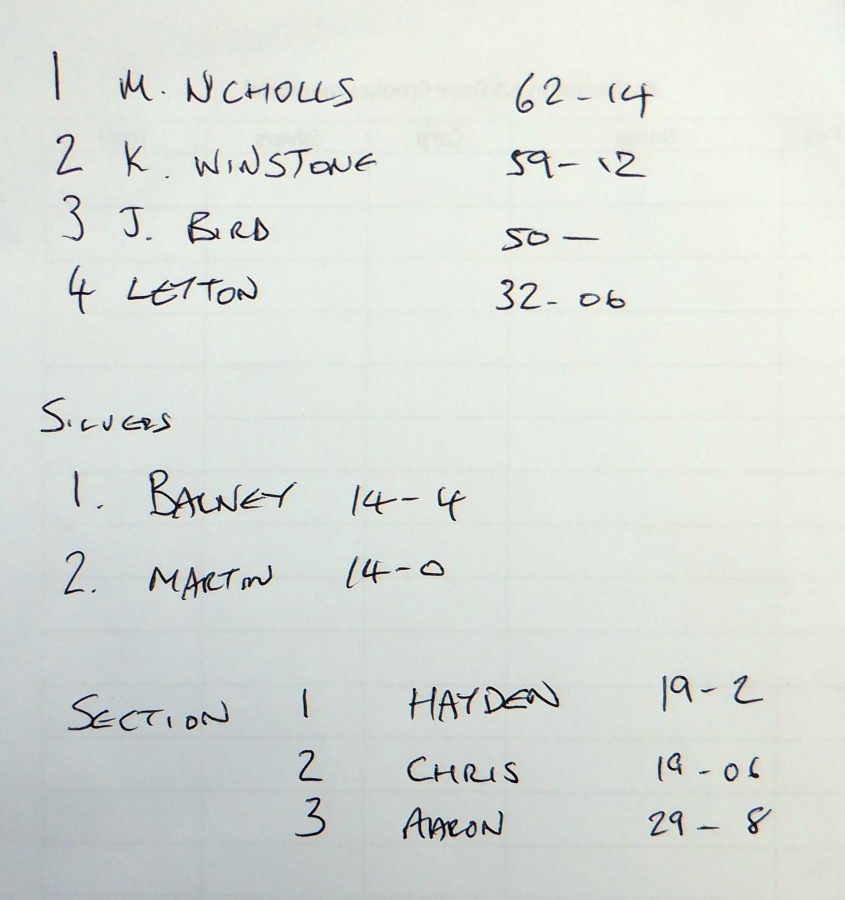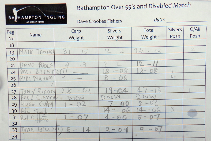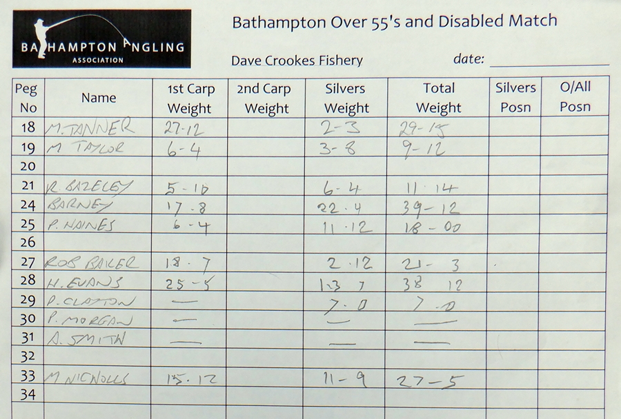 No Carp, with my Silvers weighing 8 lb 6 oz which amazingly got me last in the Silvers payout by default, thanks to the waggler I think.